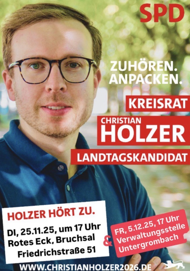 Los geht es um 17 Uhr mit einer Gesprächsrunde in Bruchsal im Rahmen seines Dialogformats „Holzer hört zu“. Treffpunkt ist im Roten Eck, Friedrichstr. 51, in Bruchsal. Gemeinsam mit interessierten Bürgerinnen und Bürgern möchte Holzer und auch SPD-Kreisrat Eberhard Schneider aktuelle Themen vor Ort diskutieren, Anregungen aufnehmen und über kreispolitische Herausforderungen sprechen.