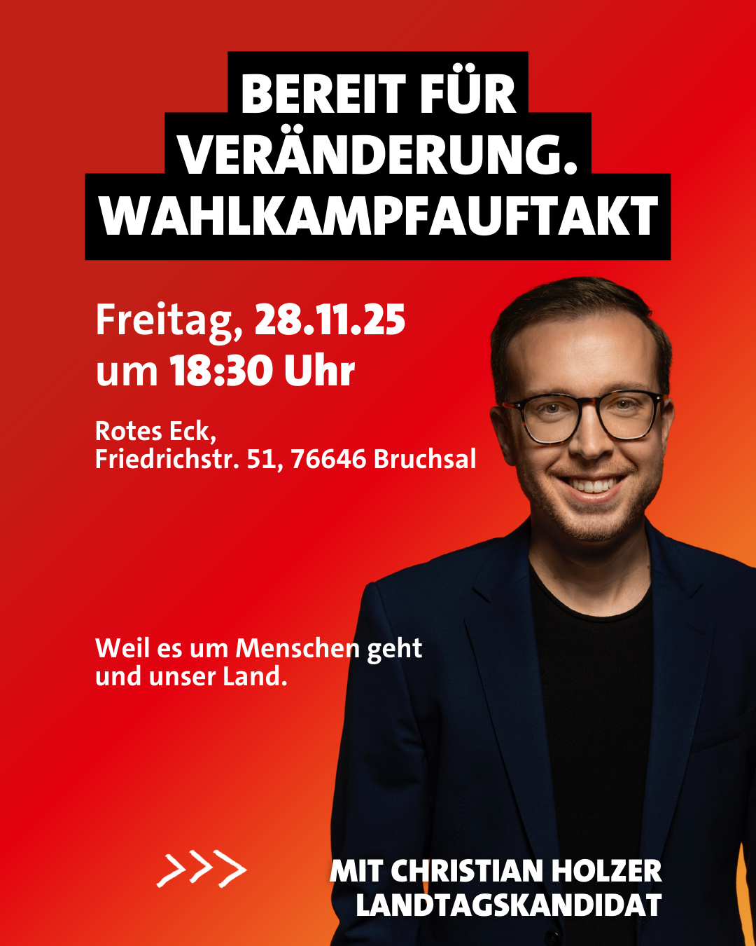 Bruchsal – Mit einer Auftaktveranstaltung unter dem Motto „Bereit für Veränderung“ startet der SPD-Landtagskandidat Christian Holzer am Freitag, 28. November 2025, um 18.30 Uhr offiziell in den Wahlkampf für die Landtagswahl Baden-Württemberg. Die Veranstaltung findet im Roten Eck, Friedrichstraße 51, 76646 Bruchsal statt.
