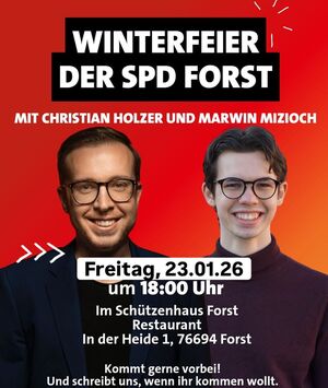 Schön, dass Sie uns besuchen! Auf unserer Internetseite möchten wir Sie über die Arbeit der ältesten Partei in Forst und der SPD- Gemeinderäte im Forster Gemeinderat informieren. Der SPD-Ortsverein ist als kommunalpolitische Vereinigung organisiert. Die kommunalpolitische Arbeit ist am Wohl von Forst und ihrer Einwohner ausgerichtet. Politik lebt vom Mitmachen. Wir freuen uns über Ihre Kommentare, Diskussionsbeiträge und Ihre aktive Mitgliedschaft. Auch Ihre Meinung kann hier veröffentlicht werden, wenn Sie diese an uns schicken. Wir wünschen Ihnen viel Spaß beim Besuch unserer Internetseite.