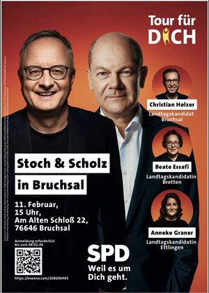 Bundeskanzler a. D. Olaf Scholz kommt am Mittwoch, 11. Februar 2026, um 15 Uhr nach Bruchsal. Gemeinsam mit dem SPD-Spitzenkandidaten für die Landtagswahl in Baden-Württemberg, Andreas Stoch MdL, sowie den SPD-Landtagskandidierenden Christian Holzer (Bruchsal), Beate Essafi (Bretten) und Anneke Graner (Ettlingen) lädt die SPD zu einer öffentlichen Dialogveranstaltung ein.